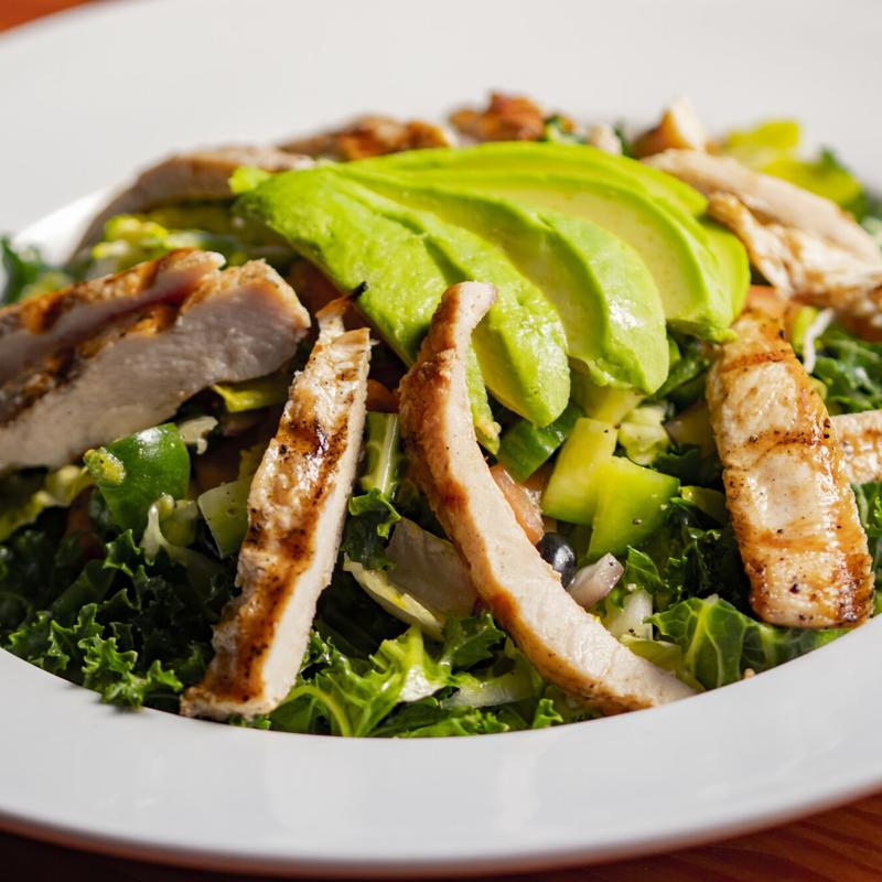 Kale, avocado, tomato, onions, broccoli, cucumber, black beans & grilled chicken, tossed in our homemade fresh lemon pepper dressing