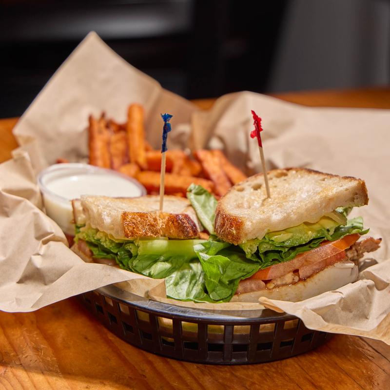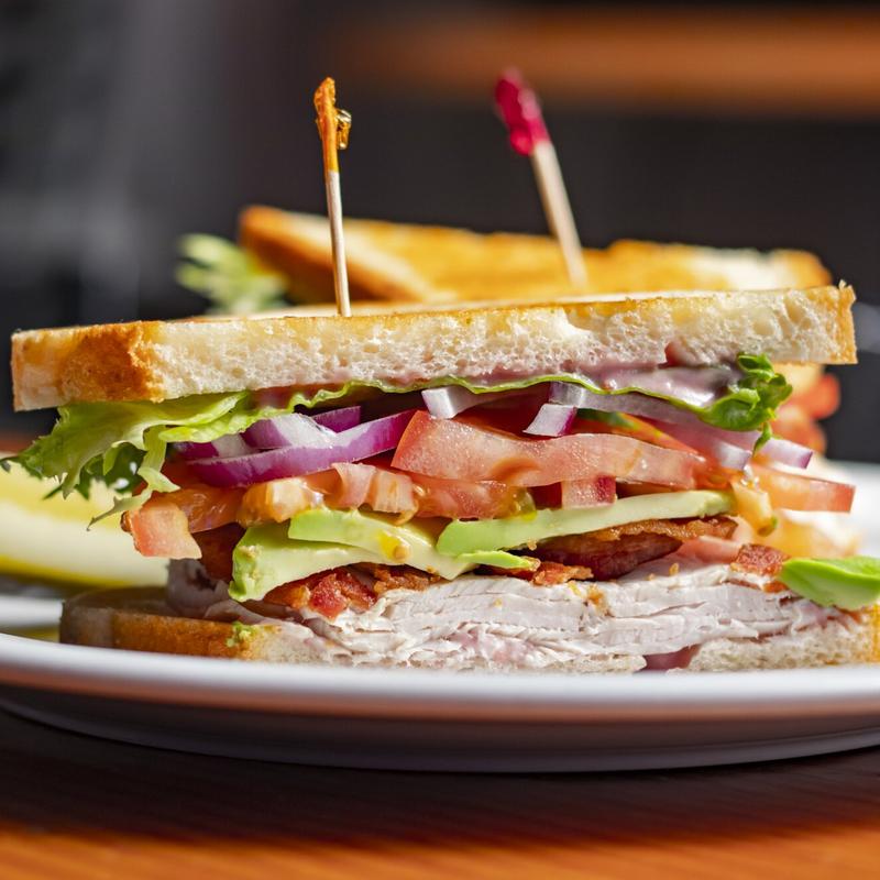 Fresh baked turkey with bacon, lettuce, tomato, onion, avocado & cranberry mayo on whole wheat bread